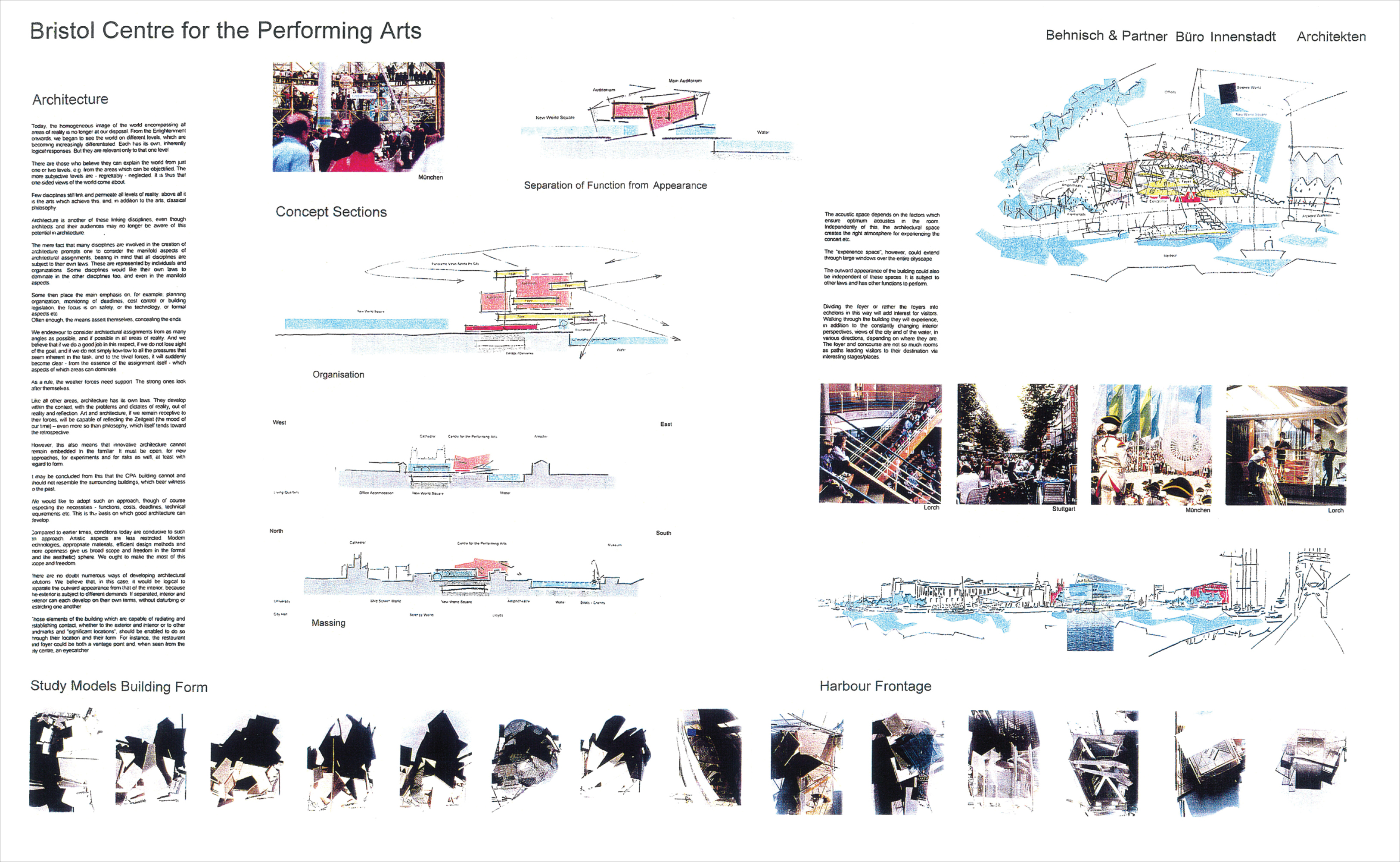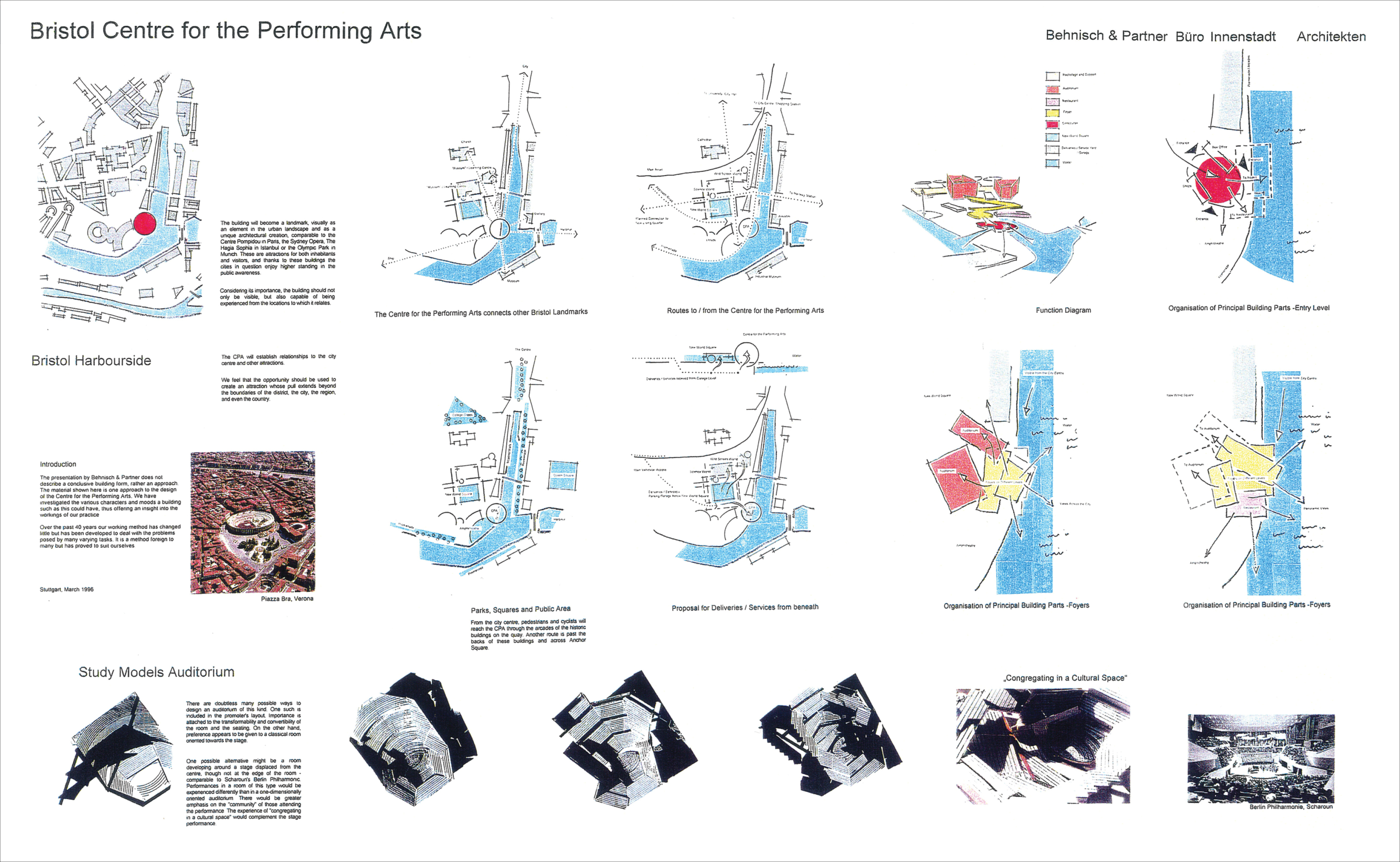 The physical separation between the concert auditorium, the dance theatre and the administration area also permits the building a significant transparency at the main entrance and foyer. Through this separation, which forms the entrance hall, a visitor can indirectly experience the quayside of the harbour from New World Square. Indirect sightlines through the building allow views of the harbour, the Arnolfini Gallery, the Industrial Museum and the foliage lining the opposite quayside. Through this transparency one of the great attractions of the Harbourside, the harbour itself, will be preserved and enjoyed.